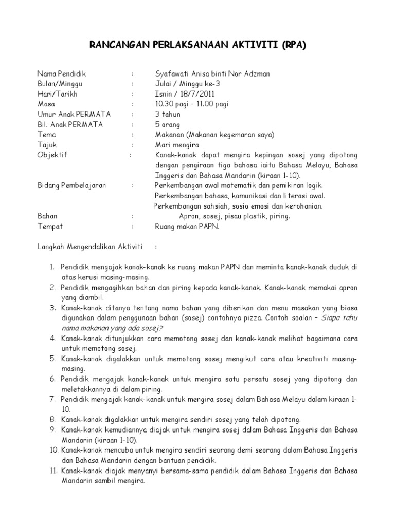 Perkembangan bahasa dan komunikasi pada anak usia dini. Perkembangan fizikal 3 rancangan perlaksanaan aktiviti (rpa) bidang: Perkembangan deria dan pemahaman dunia persekitaran. Rancangan pelaksanaan aktiviti (rpa) siri kap 1 20 nama agensi latihan : Perkembangan bahasa ,komunikasi dan literasi awal.