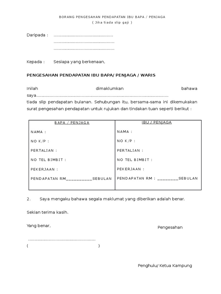 Borang pengesahan pendapatan keluarga (hanya diisi oleh bapa/ibu/penjaga yang tidak mempunyai slip gaji/ penyata email protected yang tidak bekerja). Surat akuan pengesahan pendapatan ibu bapa. Bantuan tambang dan keperluan diri. Borang pengesahan pendapatan tanpa slip gaji. Surat pengakuan pendapatan bagi ibu bapa / penjaga yang tiada penyata gaji dengan segala hormatnya saya merujuk perkara di atas.