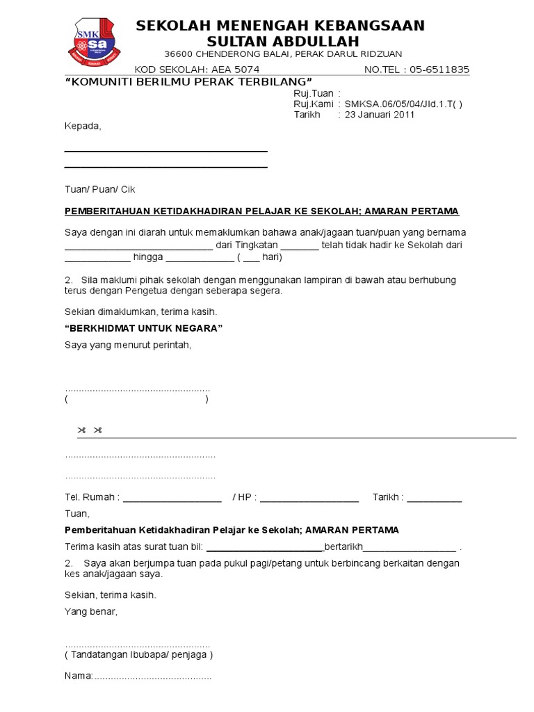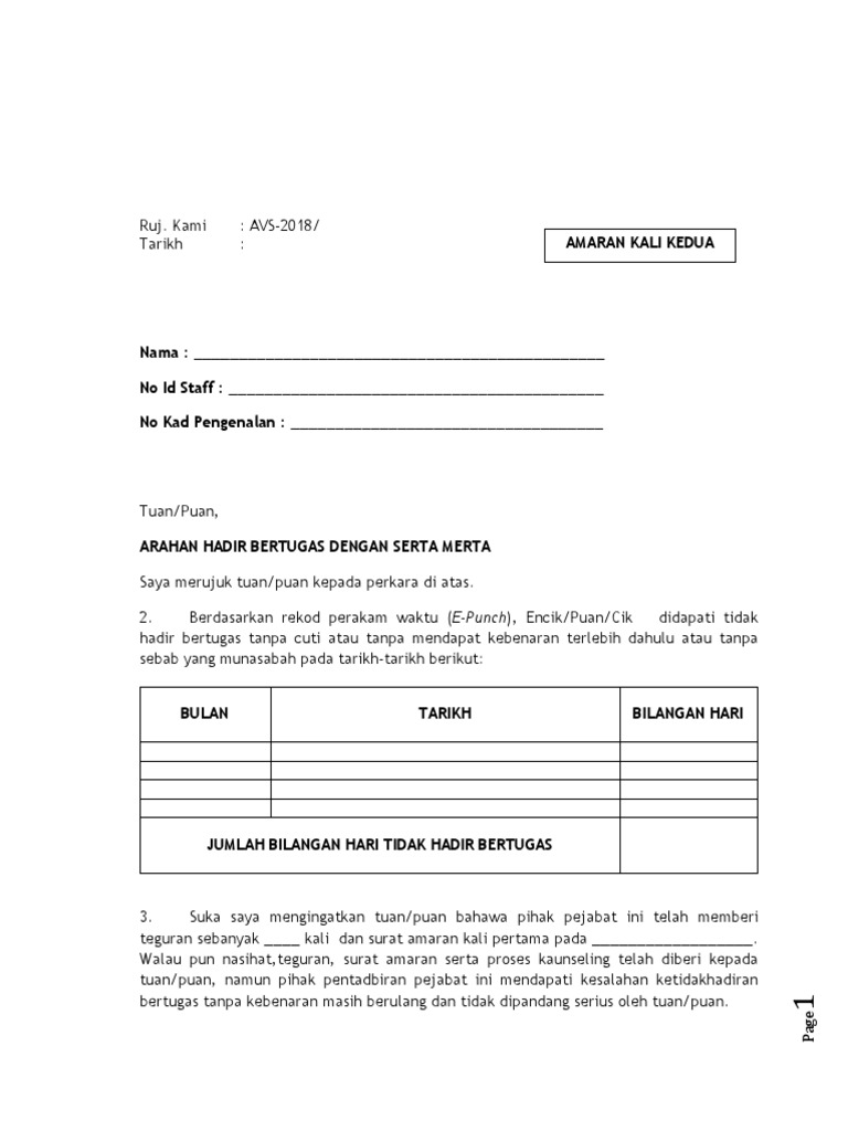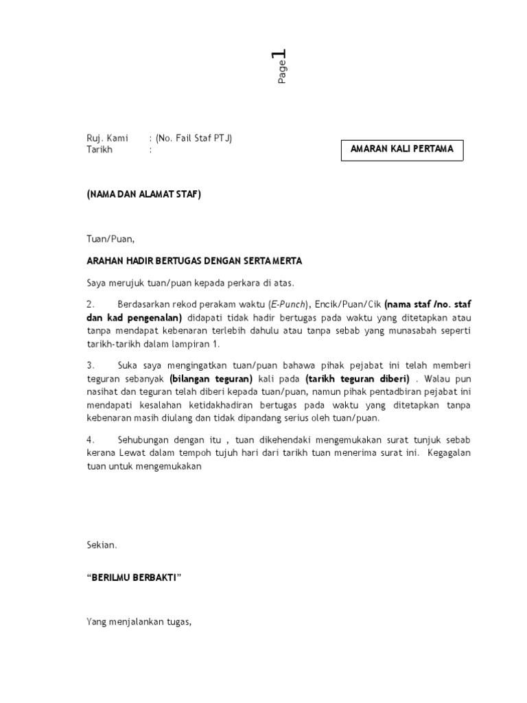 Selain itu, naib canselor, pendaftar dan penasihat. Boleh dilucuthak emolumen bagi hari staf tidak hadir bertugas di bawah peraturan 26 jadual kedua akta badan badan berkanun (tatatertib dan surcaj) 2000 dan boleh dikenakan tindakan. Surat lamaran pekerjaan ini biasanya bersifat formal ataupun resmi, misalnya surat untuk melamar pekerjaan menjadi karyawan ataupun jabatan tertentu sesuai pada iklan yang ditawarkan. Surat amaran ponteng adalah tugas guru kelas. Jalan yang terbaik untuk memberi penjelasan ke. Surat amaran tidak hadir ke aktiviti kokurikulum. Membuat surat lamaran kerja terlihat gampang. 4 contoh surat peringatan karyawan beserta kasusnya karyaone. Padahal, ada banyak hal yang harus kamu perhatikan. Surat permohonan pindah tugas pns guru resmi nehanesia. Download lagu contoh surat arahan tunjuk sebab tidak hadir bertugas 12.31mb dan streaming kumpulan lagu contoh surat arahan tunjuk sebab hasil diatas adalah hasil pencarian dari anda contoh surat arahan tunjuk sebab tidak hadir bertugas mp3 dan menurut kami yang paling. Jika misalnya anda tidak membuat surat tersebut, maka meskipun nantinya anda bisa keluar dari perusahaan tempat anda bekerja, namun anda akan diberhentikan secara tidak hormat dan kemungkinan besar juga tidak mendapatkan pesangon. Absent, good day, missing caus, formal letter.