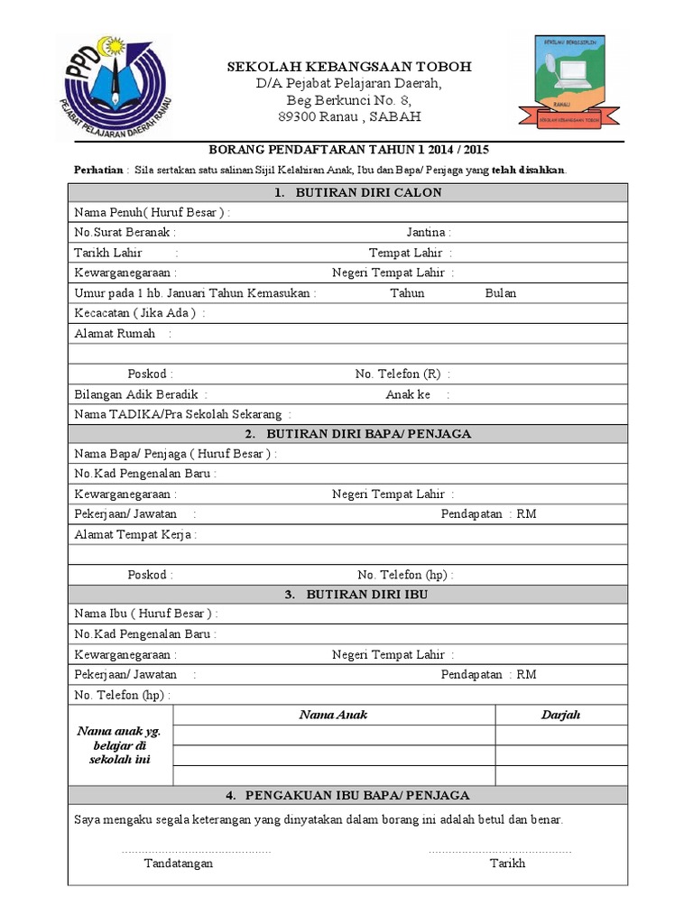 Maklumat mengenai permohonan pendaftaran online tahun 1 2020/2021 kemasukan tahun 1 ambilan 2020/2021 adalah seperti berikut borang yang lengkap diisi perlu dicetak dan diserahkan kepada sekolah yang dipohon beserta dengan senarai semak yang dinyatakan di dalam borang. 8, 89300 ranau , sabah. Setelah selesai mengisi borang elektronik, anda boleh menekan butang : Buat semakan borang pendaftaran tahun 1 2021 ambilan kemasukan murid dan permohonan penempatan, samada anda lakukan daftar darjah 1 online atau pun. Permohonan pendaftaran murid ke tahun 1 2022 / 2023 boleh dibuat menerusi sistem aplikasi pendaftaran atas talian (spat) kementerian pendidikan malaysia (kpm).