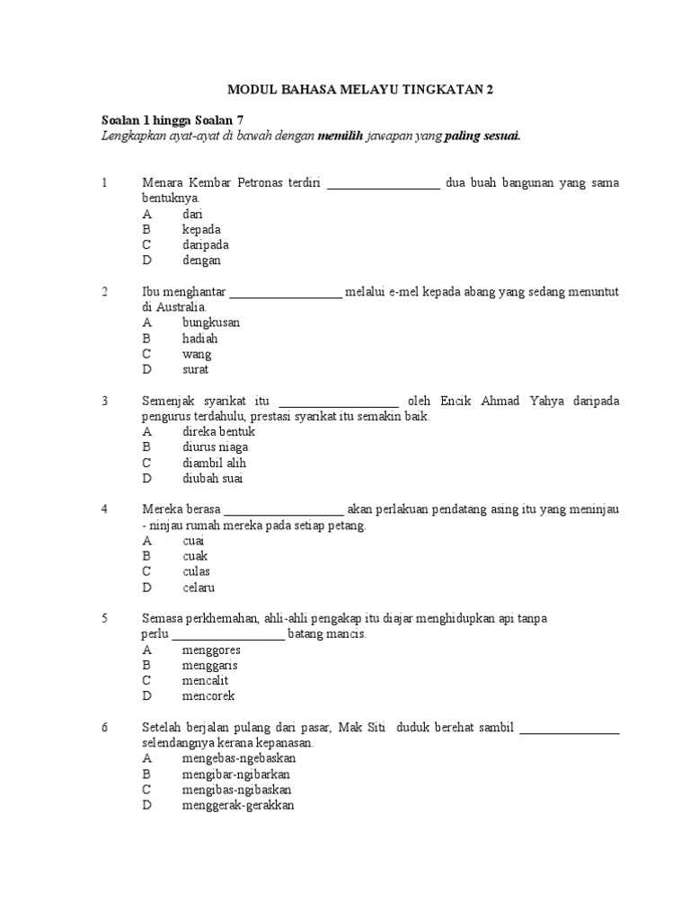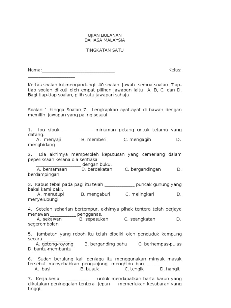 1) jalan yang senyap itu jarang dilalui oleh pemandu kerana mereka berasa takut untuk. Koleksi soalan, latihan, nota bahasa melayu tingkatan 2 + jawapan. Pantun, syair, sajak, cerpen, drama, prosa tradisional (a). Peperiksaan pertengahan penggal 1 tingkatan 2. Warisan negara merupakan harta dan kekayaan bangsa yang tidak dapat dijual beli serta memiliki nilai. Jangan buka kertas soalan ini sehingga diberitahu. Ariyan perlu memb uat keputusan s amada mahu. Soalan latihan bahasa melayu tingkatan 2. Kertas peperiksaan ini adalah untuk subjek bahasa melayu. Chess0099@gmail.com kertas model ujian pencapaian sekolah rendah bahasa melayu Betulkan frasa yang bergaris bagi ayat berikut : Latihan bahasa melayu tingkatan 2. Baca petikan di bawah kemudian buat satu ringkasan tentang faedah permainan tradisional kepada remaja.